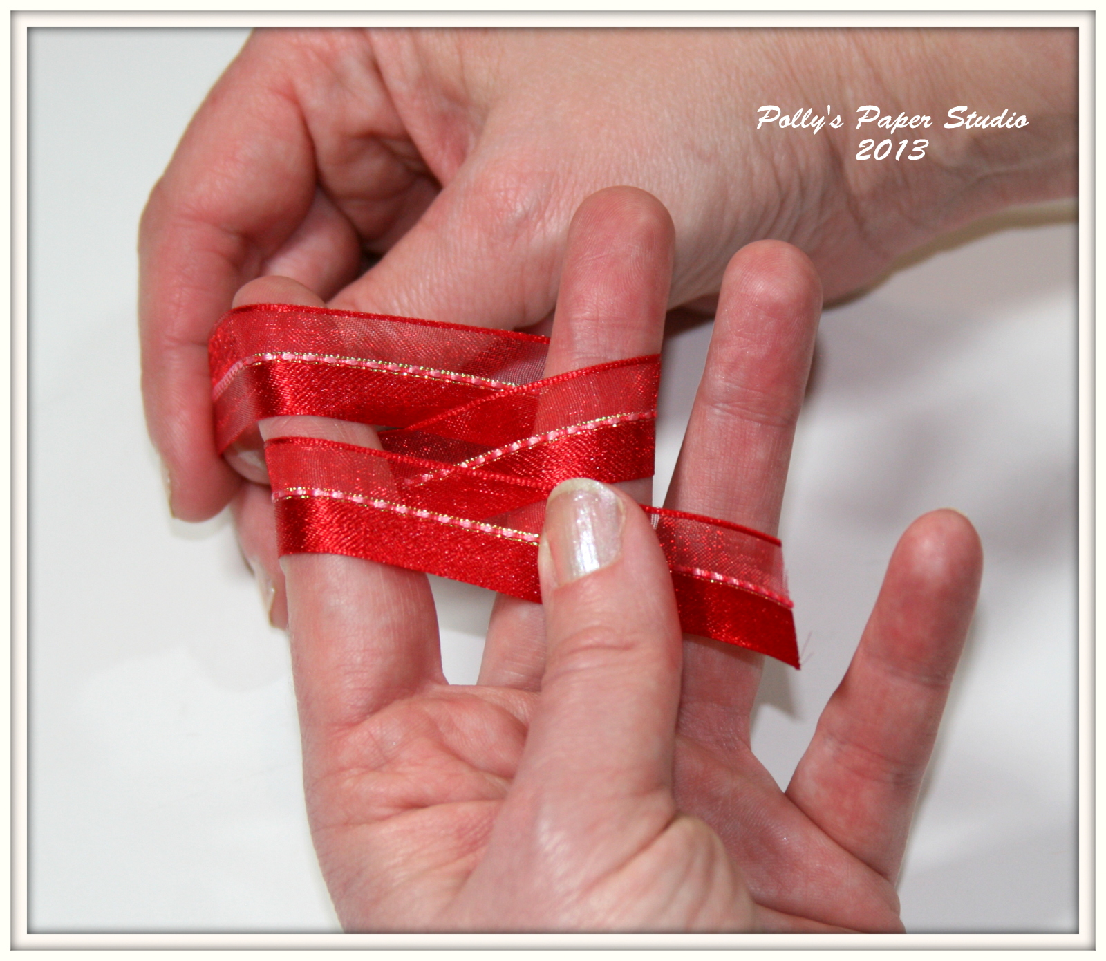 Wrap the ribbon around your middle finger and weave it back through between your fingers.Your ribbon should now be wrapping over your index finger again.