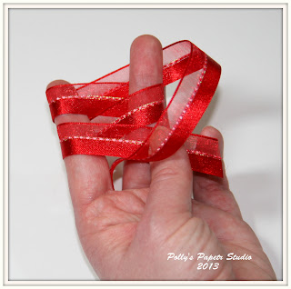 If you're right handed like me..hold the ribbon in your left had between your thumb and middle finger....leaving a bit of a tail. If you're left handed...I'm guessing you would do the opposite???? Next wrap the ribbon over the top of your index finger.