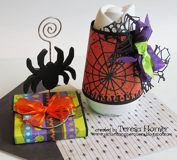 My first project is a card I did using a spider web embossing folder, Penny Black Stamp, We R Black Widow 6x6 papers and my favorite check ribbon ever from the Ribbon Club Assortment. I also used just a bit of this neat "black webbing ribbon" that looks like Spider webs and is great for little things.