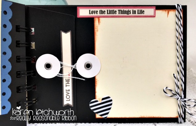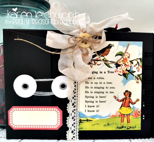 Hello, everyone! Welcome to the Really Reasonable Ribbon Blog today as I (Karen) share a sweet mini album I created using lots of great OA supplies and Really Reasonable Ribbons goodies. I started my mini album with some black chalkboard envelopes that I cut using my Zutter binding machine to add the spiral binding. I covered each page of the mini alnum with October Afternoon patterned papers and embellishments, and adorned them with lots of luscious Really Reasonable Ribbons that I will explain as I showcase each lovely page of the mini album. This will be long, so please bear with me.