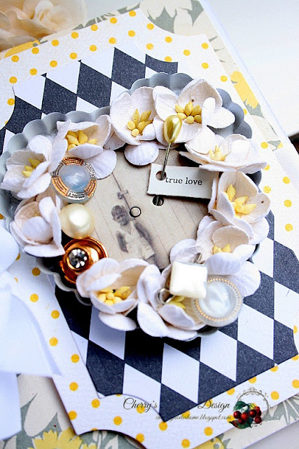 The pages were made from large bingo boards that I covered with patterned papers, stickers, buttons, ribbons, photo mats, journalling spots, and pockets for saving photos and memories of this special girl's birthday party. On the cover, you will see a bow made with