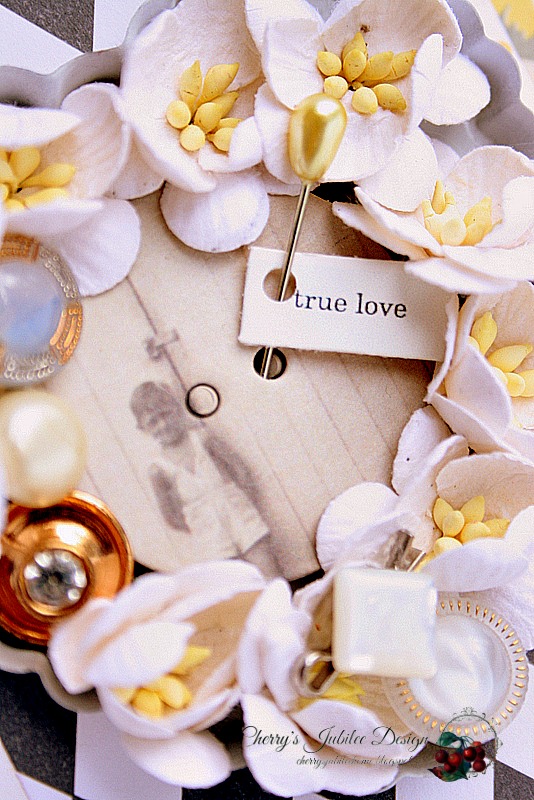 The other side of the glassine bag (above)is also covered in patterned papers, border stickers, chipboard pieces, sticks, and has a cute vintage card attached with the image of an old-fashioned birthday party. It's adorable, and the back of it can be used as another photo mat. It's attached with a miniature clothes pin holding snippets of