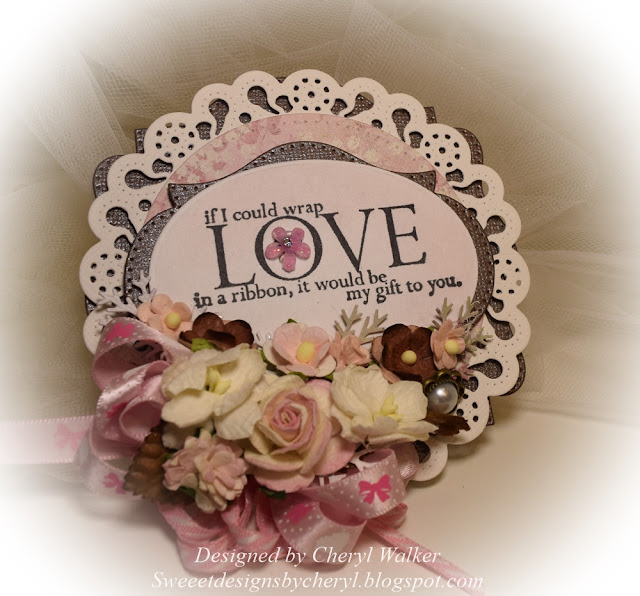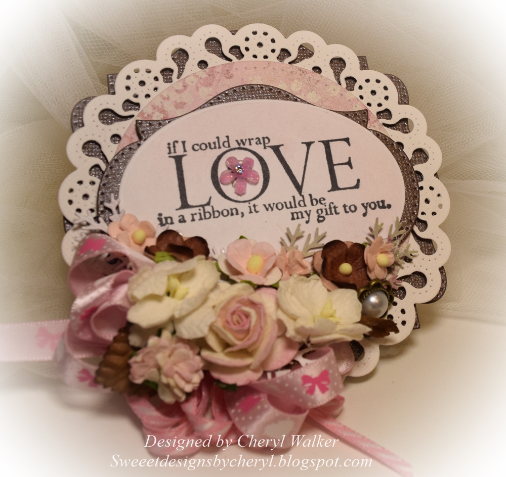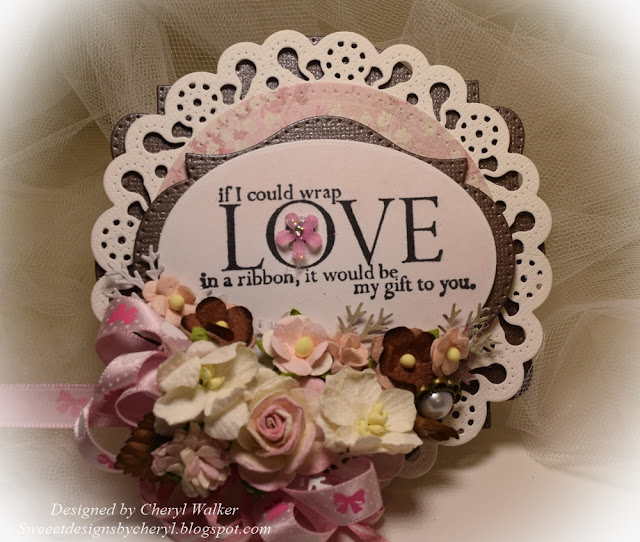 Next to start the cluster of flowers and ribbon, I started with the 1/8" striped ribbon, glued it down and then my looped bow made out of the DARLING Really Reasonable Ribbon "Hearts & Bows on pink pearl satin" . After that I glued down the brown leaves and some branches. Then I added the rose and other flowers which are all listed below. I really had a lot of fun creating this tag, and will add it to a birthday gift. I think I know just the one.