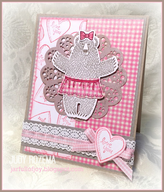 I stamped my bears in Tip Top Taupe ink, and the hearts in retired Regal Rose. The apron and bow were stamped in Rich Razzleberry and colored with R83 and R85 Copics.