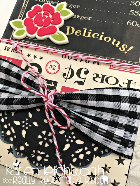 Hello, dear blog friends! It's Karen Letchworth here posting today with a sweet card that I made a couple of weeks ago. The inspiration for this card goes to the talented Amy Sheffer from a card she shared on Pinterest several years ago. I fell in love with the layout of her card, and it really inspired me. I made my card by using up some older patterned papers and several FABULOUS goodies from Really Reasonable Ribbon.