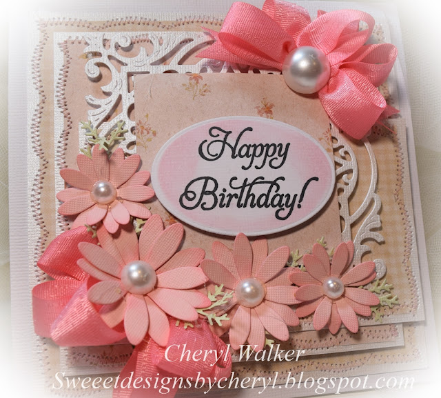 On my card I chose to use some random design papers I came across in my stash after cleaning up my room this past week. It's funny how you find things you haven't seen in a while...hehehehe. I then used Cheery Lynn Dies for my flowers and branches, and in the centers I used RRR Pearls, Love how perfect these are for my flowers. I do love how this one turned out, and the colors look so pretty! LOVE working with the satin ribbon as it makes for easy pretty bows!