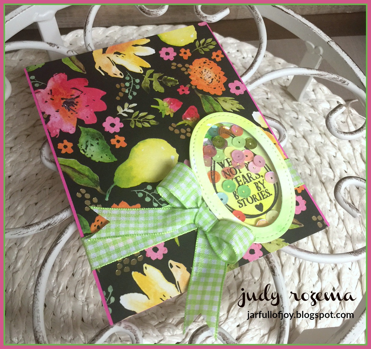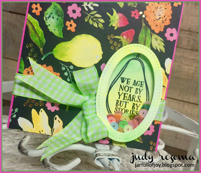 I added my acetate sheet to the frame, and carefully placed my colored sequins (Doodlebug) on the pear panel, then added the frame on top.