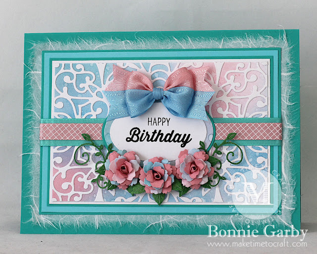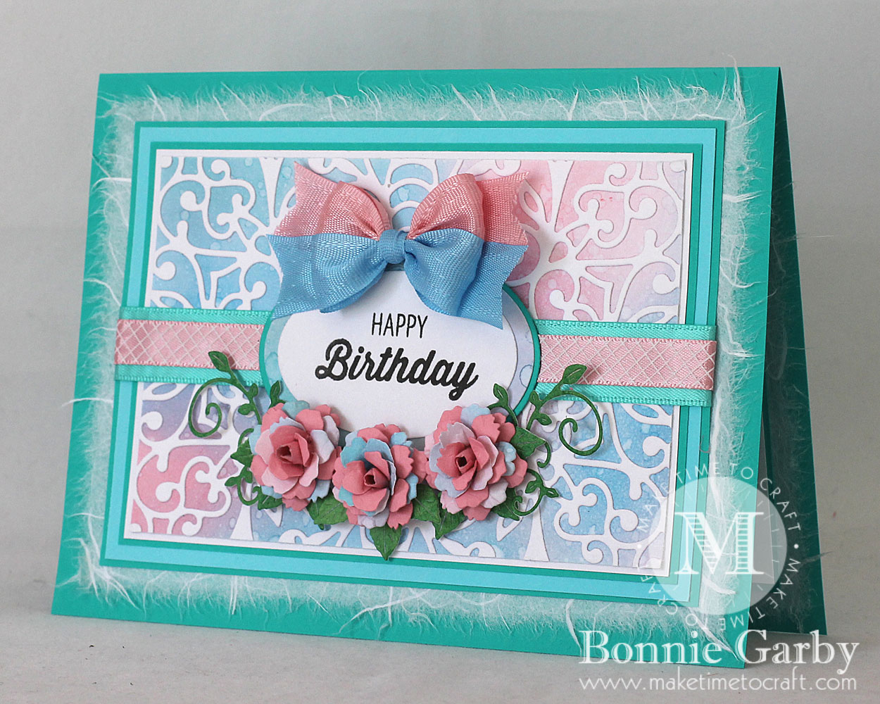 My card is a lovely mix of pretty ribbons from Really Reasonable Ribbon and beautiful dies from Cheery Lynn Designs. My background paper was made with Distress Inks so I could pull in several of the colors from the Ribbon Club Assortment. I love the way it turned out.