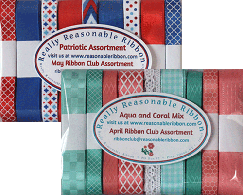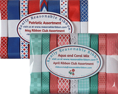 The May and June assortments each contain 9 styles and a total of 18 yards of ribbon. Each monthly assortment is a color or holiday themed collection of ribbon. What a fun way to build your ribbon stash and try new ribbon styles.