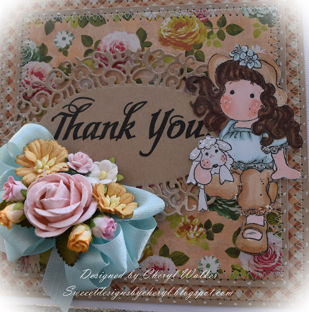 On my card I layered the same design paper with pink card stock. Then I used the darling doll print out piece. I did add sewing to all layers. Next I chose to use the sweet flower embellishments for all the corners on each layer.
