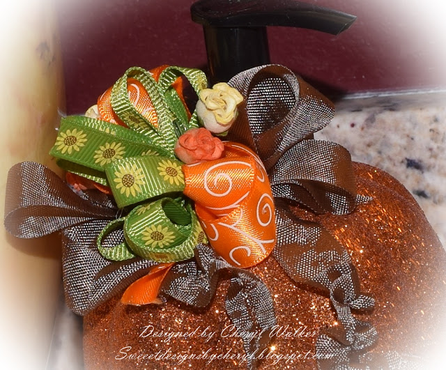 Hello everyone and Happy Monday to you all! Today I have a fun and easy project to make for the holidays using Really Reasonable Ribbon Flowers, Seam Binding, Grosgrain Ribbon, and Satin Ribbons. This Pumpkin is a soap dispenser.  I bought two of them, so I figured I would decorate them up for this month for Thanksgiving.